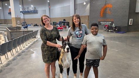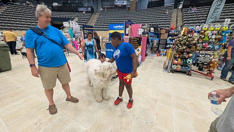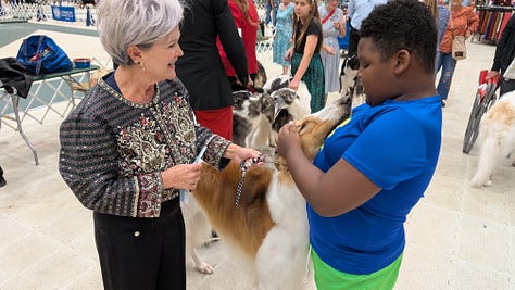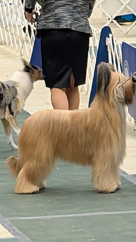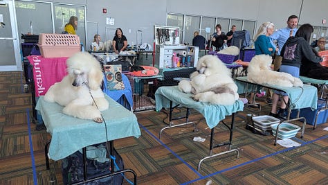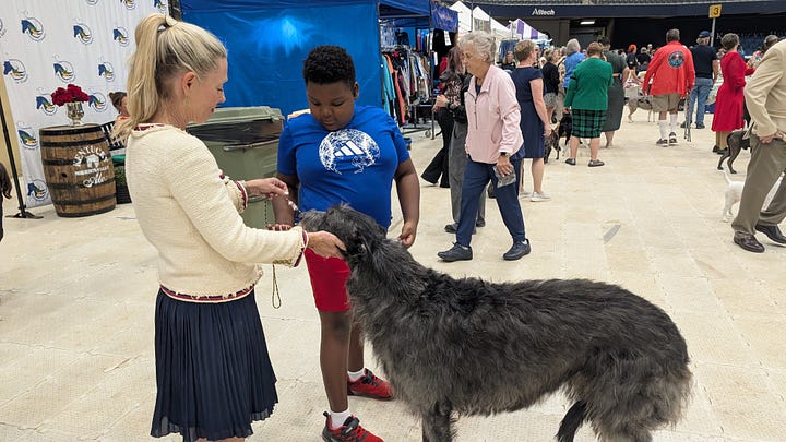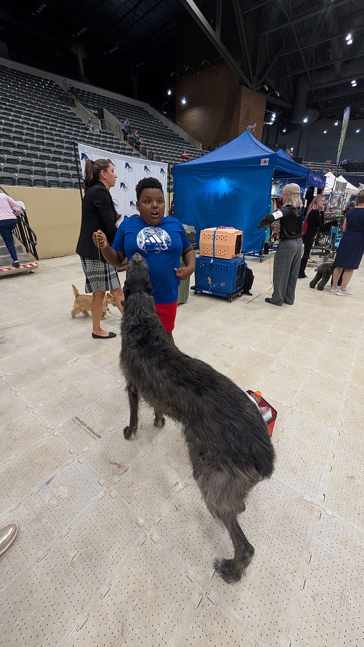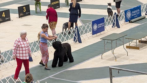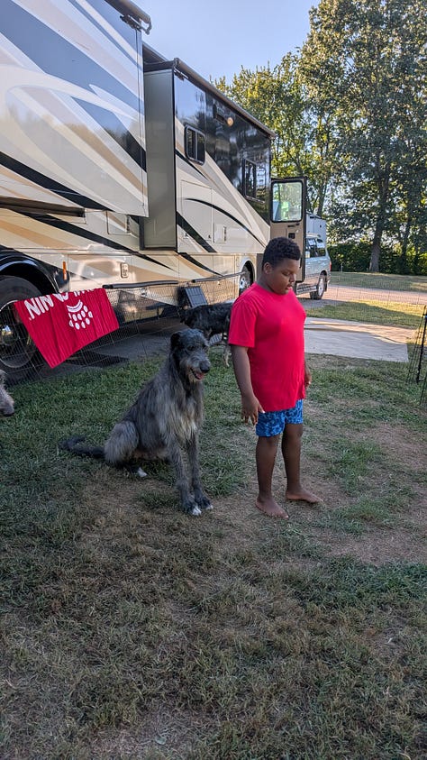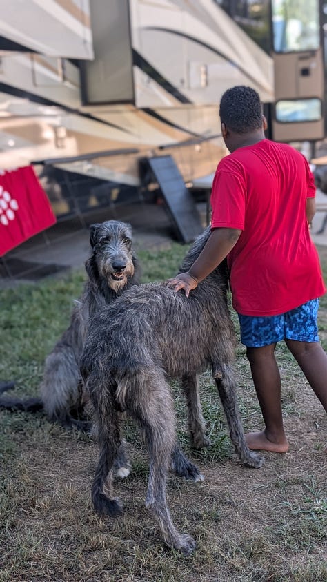 On the other side of us? Five Scottish Deerhounds. Imagine a wiry-haired greyhound on steroidsâelegant, towering, and just a little intimidating until you realize theyâre actually just oversized couch potatoes in disguise. Their humans became instant friends. The kind of âyour peopleâ friends you donât have to try withâyou just click. Maybe it was the shared experience of parenting, being fellow Aggie Alumni, or the way they leaned into lifeâs curveballs with grace and humor, but sitting around the campsite together felt like weâd known them forever. Rooting for their dogs in the ring was pure joy, and cheering when they won was a victory for all of us.